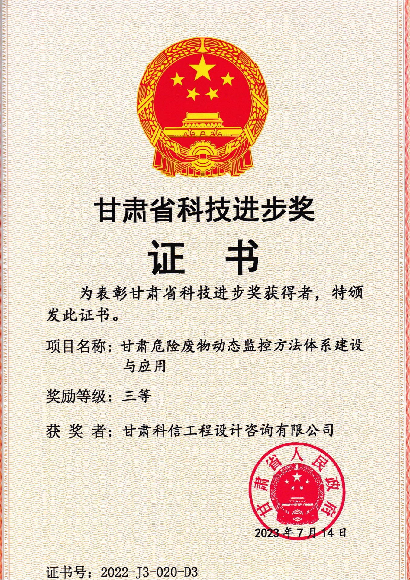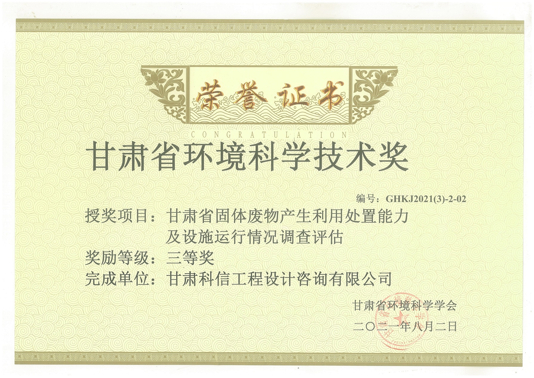 熱烈祝賀甘肅科信工程設(shè)計咨詢有限公司在2022年度甘肅省科技進(jìn)步獎評選中,以“甘肅危險廢物動態(tài)監(jiān)控方法體系建設(shè)與應(yīng)用”項目,榮獲甘肅省科技進(jìn)步三...